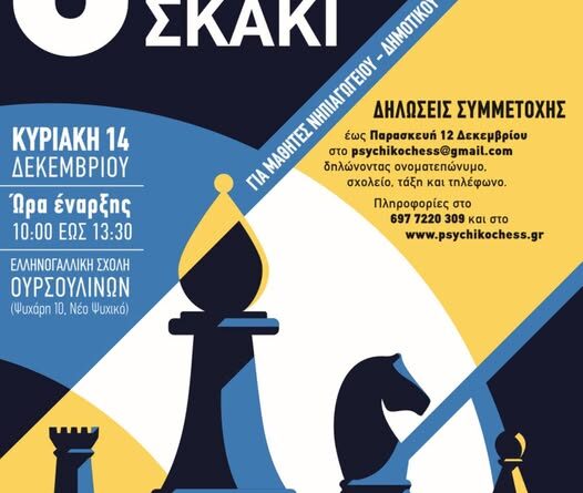 Read MoreΟ Αθλητικός Σύλλογος «Ακαδημία Σκάκι Νέου Ψυχικού» σε συνεργασία με τον Δήμο μας, προκηρύσσουν το «8ο Ατομικό Μαθητικό Πρωτάθλημα Σκάκι