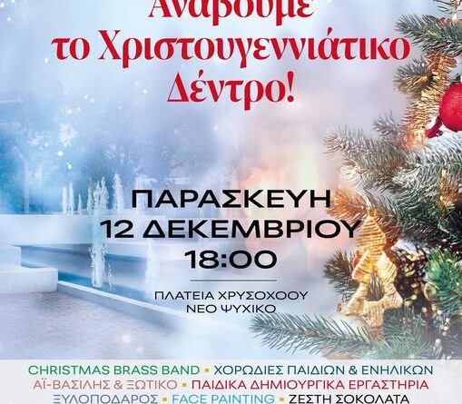 Read MoreΑΝΑΒΕΙ ΤΟ ΧΡΙΣΤΟΥΓΕΝΝΙΑΤΙΚΟ ΔΕΝΤΡΟ ΤΟΥ ΔΗΜΟΥ ΦΙΛΟΘΕΗΣ ΨΥΧΙΚΟΥ Ο Δήμος μας ανοίγει φέτος την εορταστική περίοδο με φως και μουσική,