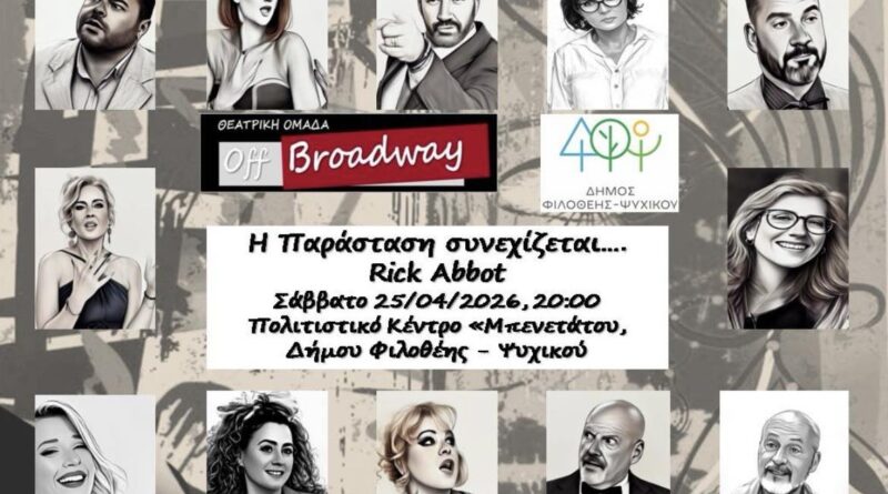 Το Τμήμα Πολιτισμού του Δήμου Φιλοθέης – Ψυχικού, παρουσιάζει τη Θεατρική Ομάδα «Off Broadway», στη σπαρταριστή κωμωδία του Rick Abbot «Η παράσταση συνεχίζεται…».